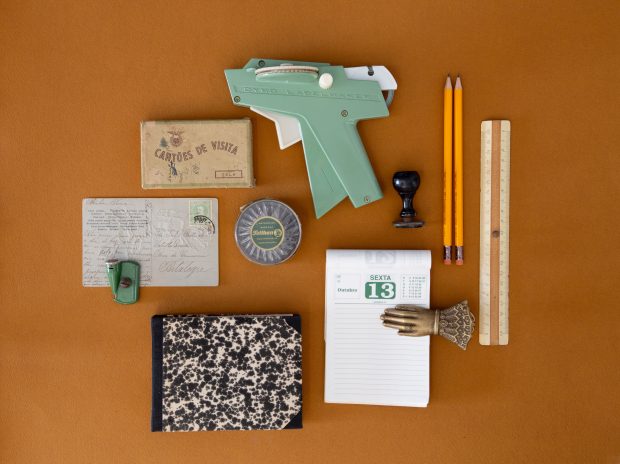 A Papelaria Moderna tem uma identidade gráfica, se lhe quisermos chamar assim, que tem muito a ver com essas referências das coisas que fui recolhendo ao longo dos anos. Mesmo alguns objetos que tenho na papelaria quando fui procurar stock para vender, tentei encontrar como eram antigamente. Hoje em dia, quando vamos procurar artigos de papelaria para comprar, a maior parte das coisas são feitas de plástico e eu tentei encontrar coisas de boa qualidade. As afias, por exemplo, são mesmo muito pesadas, são feitas em latão, mas afiam muito bem, porque têm lâminas boas, e não causam frustração. Fiz uma linha de cartões, que chamo de cartões multiusos, porque são uma linha para várias ocasiões, em que uso gravuras antigas que faziam parte do meu arquivo de gravuras, que fui guardando ao longo do tempo. Também fui procurar umas estampas que antigamente se recortavam para decorar cadernos. Foi das coisas mais difíceis de encontrar, mas descobri uma fábrica na Alemanha que ainda as produz e que faz os mesmos designs há 100 anos. Há muitas marcas também que, quando encontrei os produtos e as procurei, me deixaram muito contente por perceber que fazem as coisas da mesma maneira há muito tempo, ou que ainda são empresas familiares, ou que algumas são quase monoprodutos, porque fazem uma coisa muito bem.