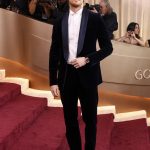 Joe Alwyn usou um smoking Dior de veludo azul-marinho com gola xale, uma camisa branca de algodão com gola de asa e sapatos derby de couro preto.