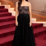 EJAE usou um vestido sem alças Dior em cetim preto com pétalas de renda.