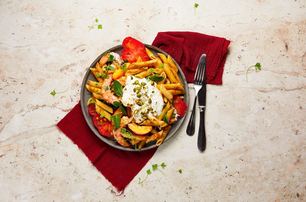 Cozer a massa de acordo com as instruções da embalagem. Deixar arrefecer. Cortar o tomate coração-de-boi às rodelas e os pêssegos em meias-luas. Descascar o camarão. Num copo de varinha mágica colocar os tomates cereja, as anchovas, o açúcar, a hortelã, o manjericão e o azeite e emulsionar tudo. Temperar com sal e pimenta a gosto. Num recipiente à parte, misturar o molho na massa. Colocar todos os ingredientes já preparados numa travessa, abrir a burrata ao meio e colocar por cima da salada. Picar os pistácios e polvilhar por cima da salada. Finalizar com pimenta preta, folhas de hortelã e manjericão a gosto.