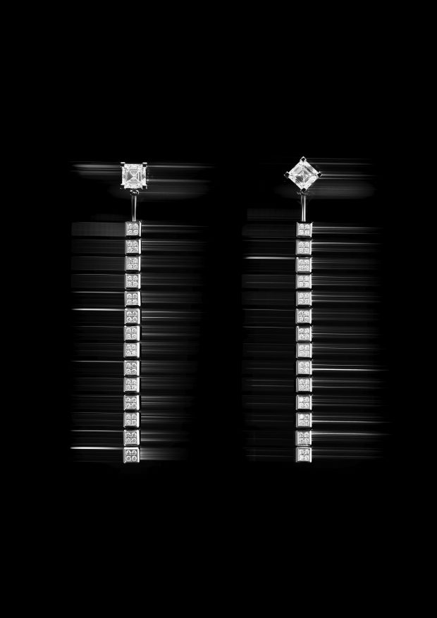 Ainda na mesma linha, um par de brincos apresenta solitários de diamante de corte Asscher de 1,2 quilates, cada um apoiado por uma linha fluida de 14 cubos cravejados de diamantes. Estes últimos podem ser removidos de um ou de ambos os lados, permitindo um estilo assimétrico ou mais minimalista.