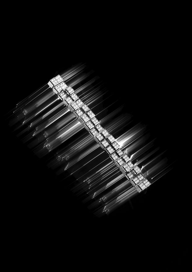 Numa alusão ao horizonte de uma cidade onde torres de vidro e aço brilham sob a luz mutável, as pulseiras e um broche multifuncional ecoam os códigos arquitetónicos da coleção através de cubos de diferentes alturas.