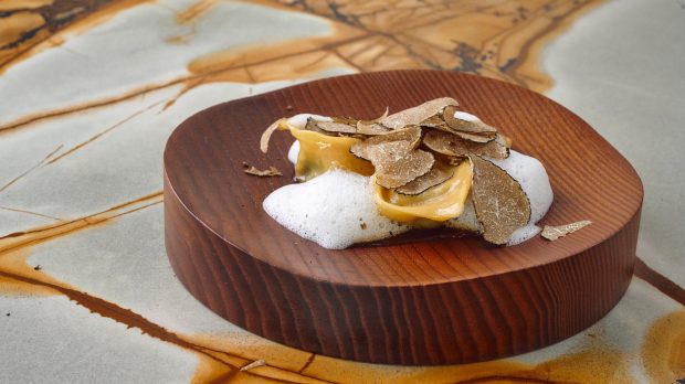 Este menu especial Dia dos Namorados, com o valor de €85 por pessoa, é composto por cinco momentos distintos. Para começar um Amuse Bouche memorável: Ostra grelhada no carvão. Um sabor subtil defumado, que desperta o paladar para o que virá a seguir. Logo depois, o Gunkan de wagyu com mousse de foie gras e trufa, uma entrada rica e deliciosa, cujo equilíbrio entre sabor e textura não é nada menos que perfeito.