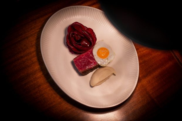 A experiência tem início com a entrada de dashi, shiso, ostras e caviar, uma entrada leve que abre o paladar para o que se segue. Entre os pratos principais, destacam-se o arroz de bivalves, algas e gamba, com sabores marítimos bem definidos, e a carne de novilho com beterrabas e ovo de codorniz, numa combinação contemporânea que valoriza o produto.