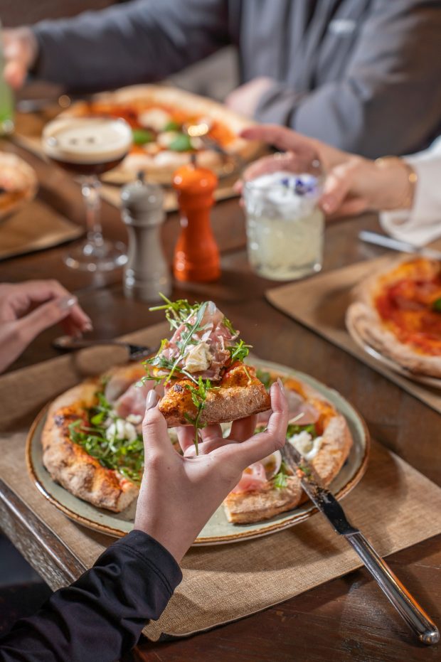 No sábado, 14 de fevereiro, a noite começa com um welcome cocktail pensado para quebrar o gelo abrir a celebração. Segue-se um couvert composto por focaccia italiana caseira, aromatizada com alecrim e flor de sal, que abre os corações (e o apetite) para o restante menu. Como entrada, será servida uma burrata acompanhada de pesto, manjericão e tomate cherry, numa combinação equilibrada e fresca que inicia a refeição. No prato principal, cada convidado poderá escolher entre duas pizzas especialmente pensadas para a ocasião: a Tartufo Nero, preparada com pasta de trufa, mozzarella fior di latte, queijo gorgonzola e carpaccio de trufa; ou a Prosciutto, com molho de tomate, fior di latte, presunto de parma, rúcula e mozzarella de búfala.