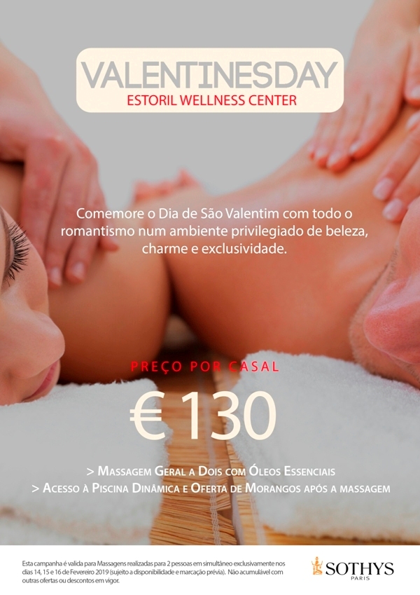 Comemore o Dia de São Valentim com todo o romantismo no ambiente privilegiado de beleza, charme e exclusividade que é o Estoril Wellness Center. O preço por casal é 130 € e inclui massagem geral a dois com óleos essenciais, oferta de morangos após a massagem, acesso à piscina dinâmica – Circuito HidroBanyan