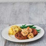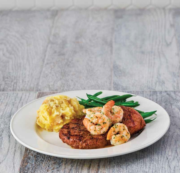 O prato principal, o “Strip Steak Scampi” é um bife da vazia temperado e grelhado e, de seguida, coberto com camarões fritos e um delicioso molho tradicional Scampi.