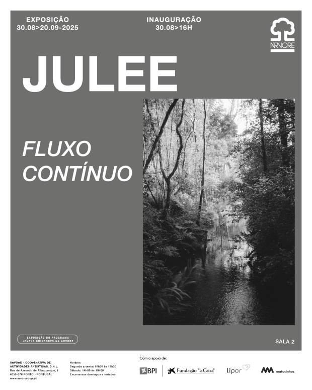 De 30 de agosto a 20 de setembro, a Árvore – Cooperativa de Atividades Artísticas, no Porto, apresenta, no âmbito do Programa Jovens Criadores, a exposição Fluxo Contínuo, a primeira mostra individual da artista Julee (nome artístico de Juliana Lee Pinto).